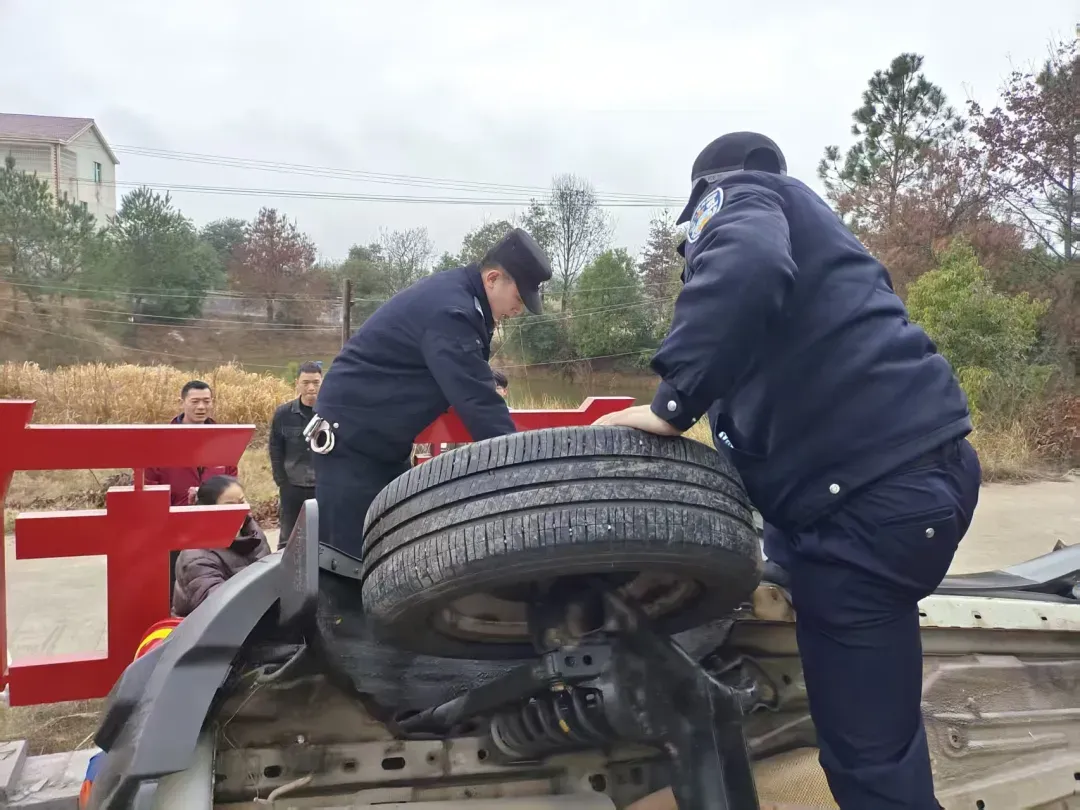▲民辅警爬上侧翻的小轿车开展救援。