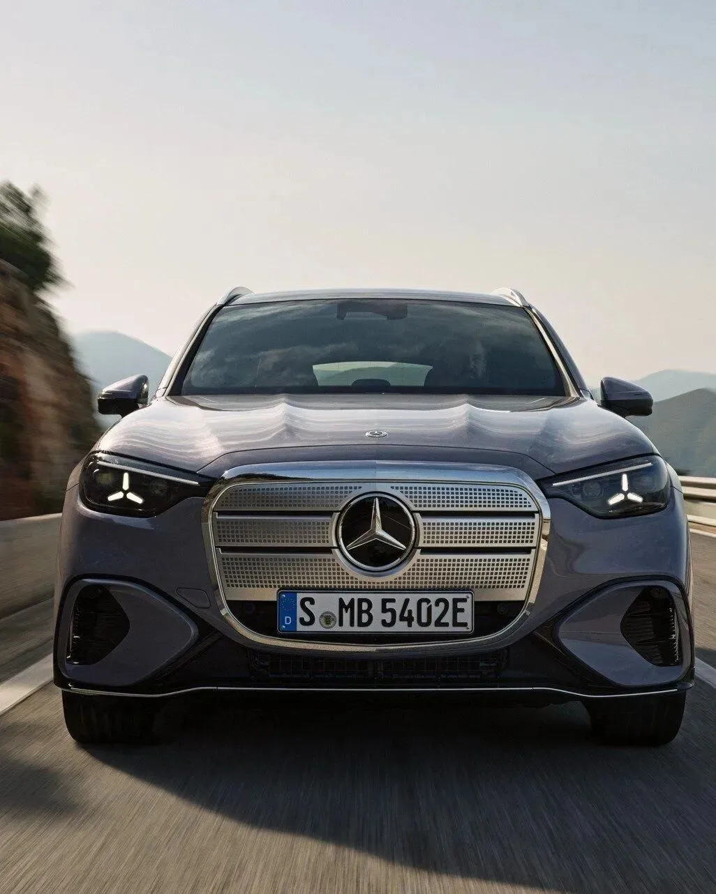 先说外观吧,我.第一眼看纯电GLC的.时.候,还真愣了一.下。这个.车前脸确实挺唬人的,一个大封闭格栅闪闪发光,官方说里面有九百多颗灯珠,我没数啊,但是.挺亮的,晚上点亮以后特别有.存在感。格栅是那种盾牌造型,下面镶了星徽,整.一.排.灯带延伸到两侧大灯,辨识度那是相当高。