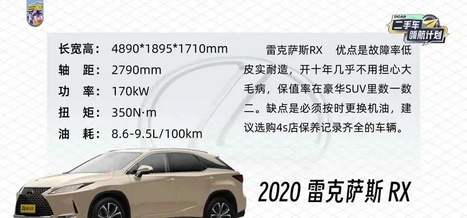 最后聊“稳健派”:雷克萨斯RX,优点是故障率低,皮实耐造,开十年几乎不用担心大毛病,保值率在豪华SUV里数一数二。