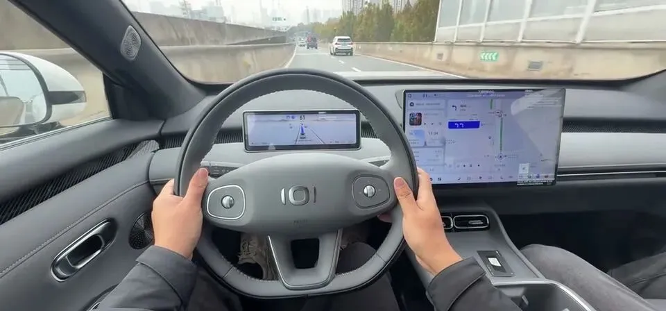 座舱观感:方向盘+大屏,属于“主流新能源审美”