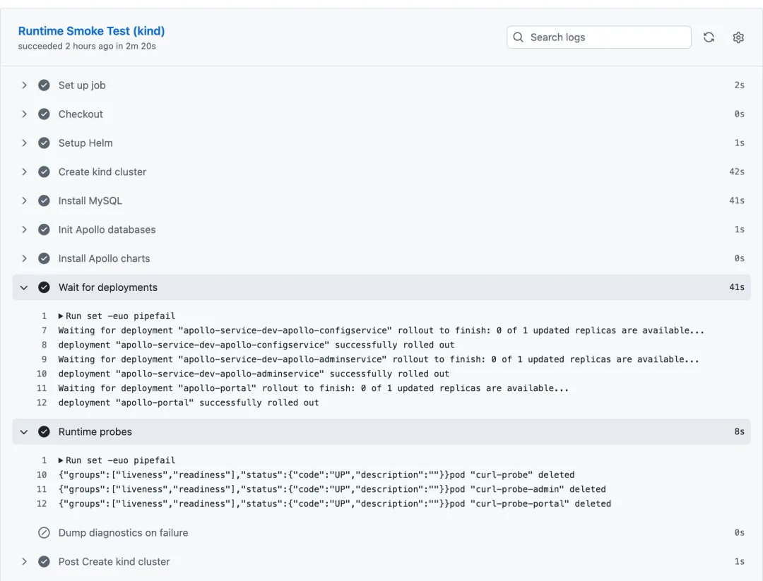 - Docker 和 Helm Chart 部署的冒烟测试,PR #5558[5]、PR apolloconfig/apollo-helm-chart#24[6]