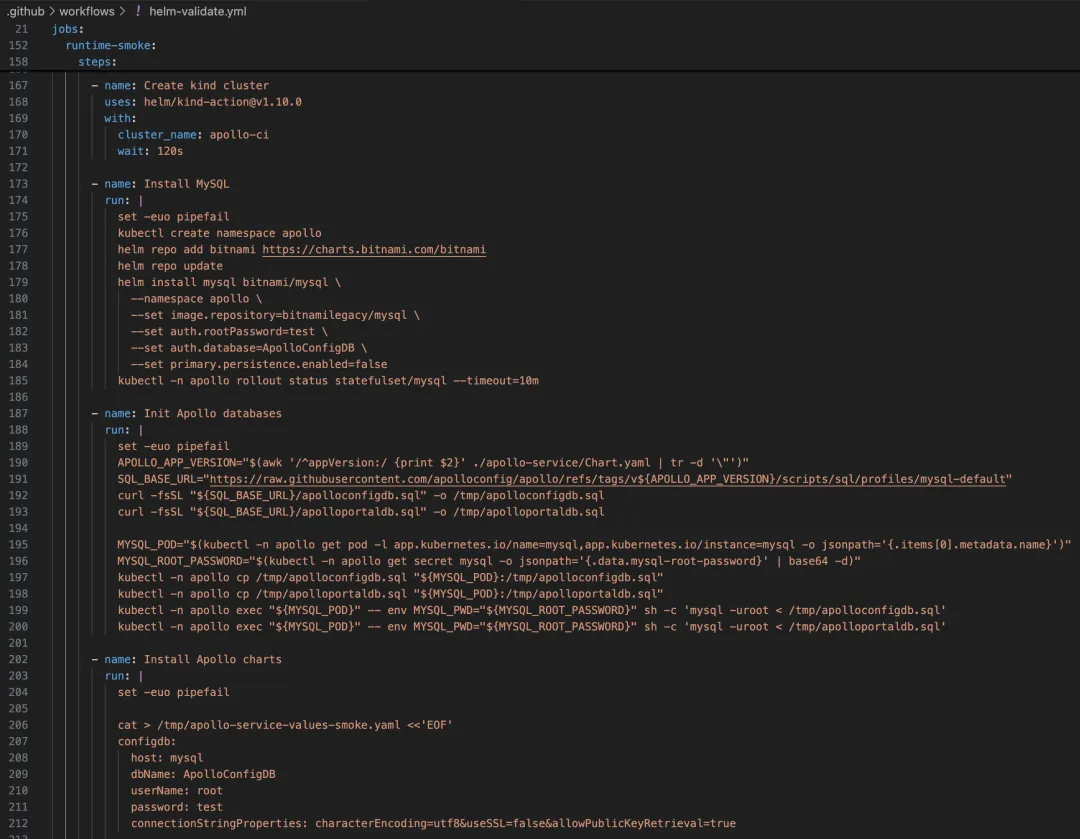 - Helm Chart 部署的冒烟测试——我原以为 Codex 会给我写一堆脚本,在我本地执行 K8s 部署,再拉起 MySQL 和 Apollo 验证。结果看到它写出来的