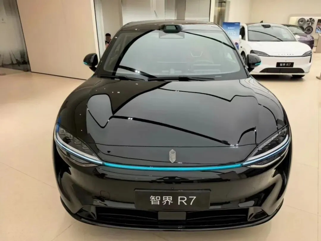 我现在在西安这边一.个4S车展的场地上,边看着实.车边录,风挺.大,咱说风阻还真有点应景。眼前.这台智界R7 Ultra,前脸那种低.趴趋势特.别明.显,比我预想的小不少。车头收得很干净,封闭式格栅+电动车典型的短前悬,这.种设计方.向没问.题,它确.实是往风阻优化去的。