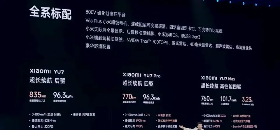 大家最关心的一定是续航。发布会给得很直接:小米YU7标准版,续航835km,96.3kWh磷酸铁锂电池。