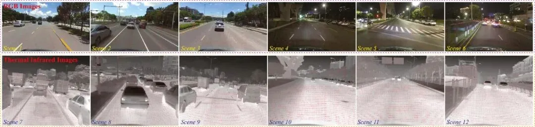 论文中的图表清晰显示:在背光或夜间条件下,当RGB图像细节丢失时,热成像依然能勾勒出车辆和行人的清晰轮廓。