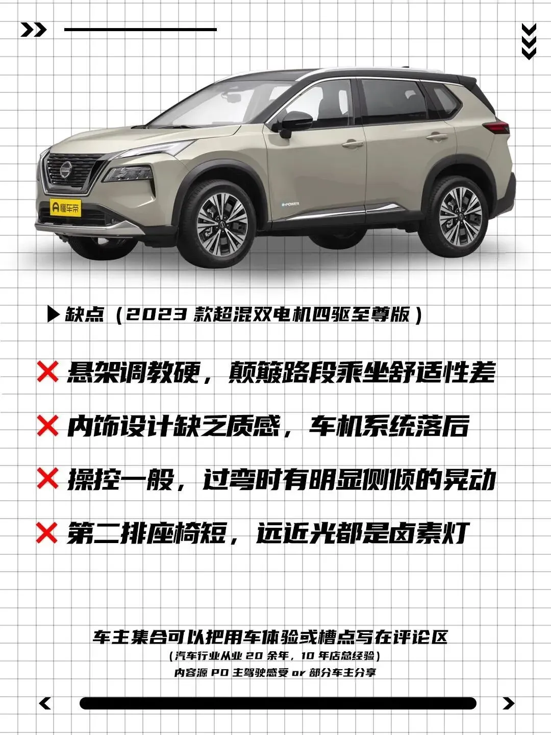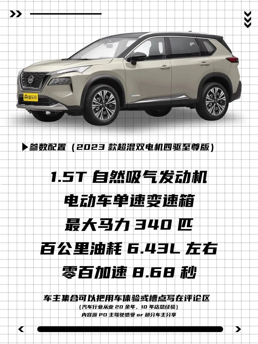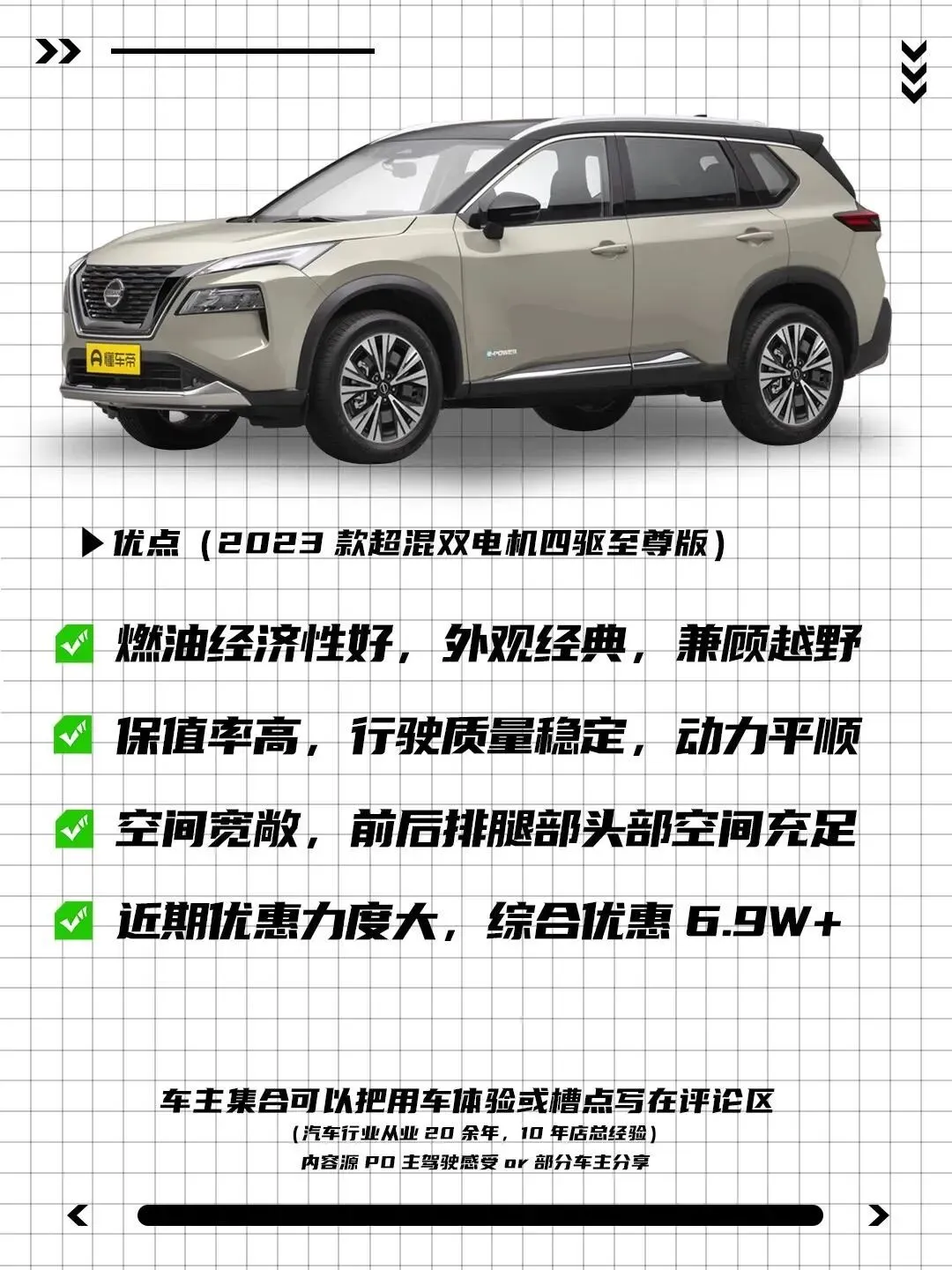 2023款日产奇骏超混双电机四驱至尊版凭借e-POWER技术的加持,在燃油经济性、动力平顺性和驾驶舒适性方面都展现出了强大的实力。虽然内饰质感和智能化配置略有不足,但瑕不掩瑜,奇骏依然是一款综合实力强劲、适合家庭使用的优秀SUV。如果您正在寻找一款省油、舒适、可靠的紧凑型SUV,奇骏绝对值得考虑。目前市场优惠力度较大,是入手的好时机。
