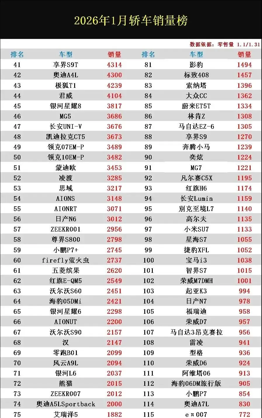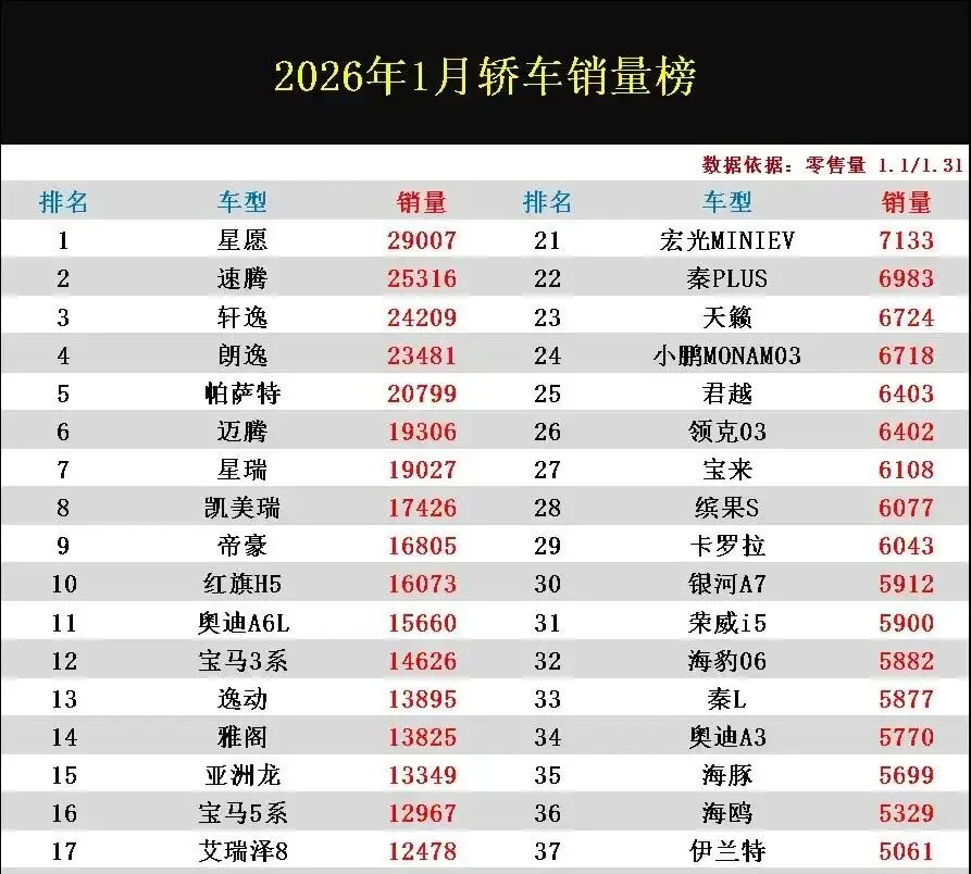 (数据来源:乘联会2026年1月轿车销量报告)