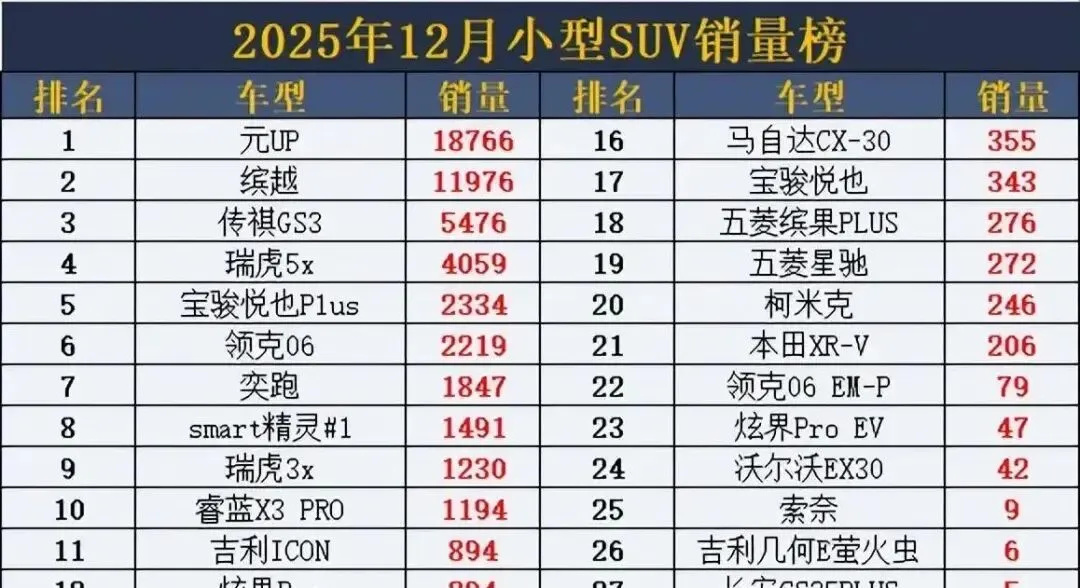## 2025年12月小型SUV销量榜炸了!前六名全是国产,合资品牌集体“消失”——这哪是买车?分明是“换胎”现场!