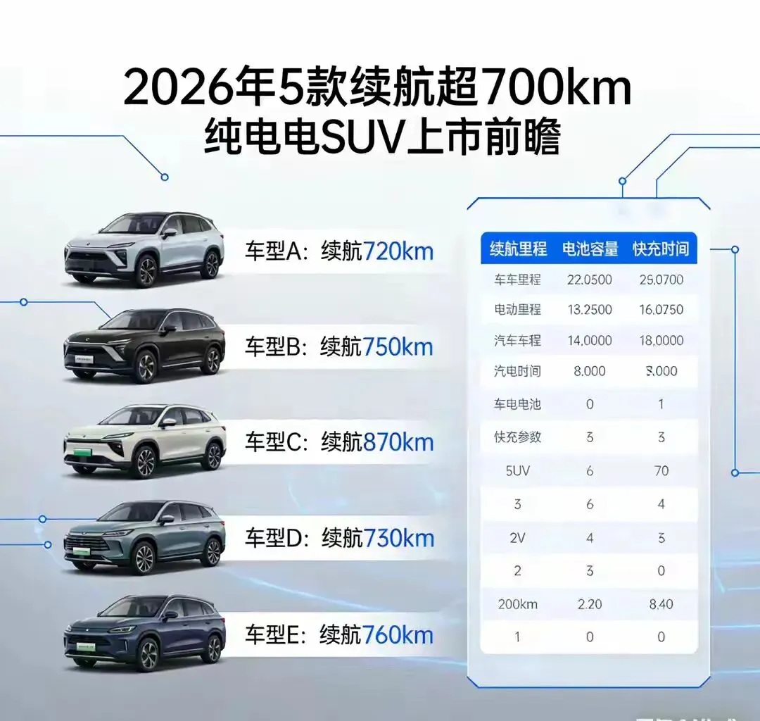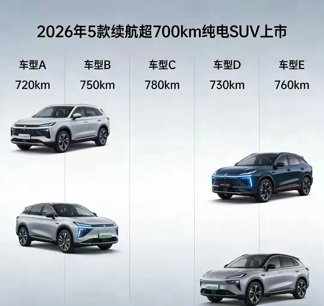 要是你也正被这些顾虑困扰,真心建议先别急着付款下单。2026年将会有一大批续航稳定突破700km的纯电SUV集中登场,涵盖家用代步、性能操控、豪华质感、硬派越野等全品类需求,价格从十几万亲民价位到几十万高端区间,全都有合适选择。这些新车不光续航扎实靠谱,还兼备高效快充、智能科技、超大空间与全面安全配置,耐心等一等,就能入手更省心、更实用的心仪座驾。