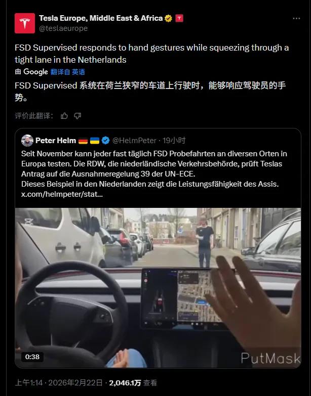 今日,特斯拉欧洲、中东和非洲官号@teslaeurope 发布了一段FSD Supervised的最新测试视频。视频显示,该系统在荷兰狭窄的车道上行驶时,能够实时识别并响应人类的手势信号。