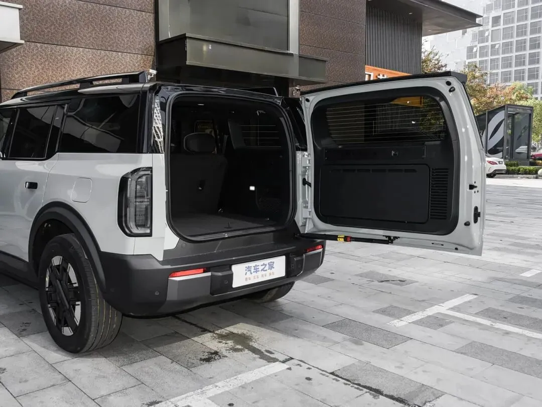 然后尾门那个设计我觉得挺有意思的,它有一个 山野厨房的功能 ,就是集成了置物台,然后配合 6.6千瓦的对外放电 ,在户外可以直接用电磁炉做饭,这个实用性就是拉满了。