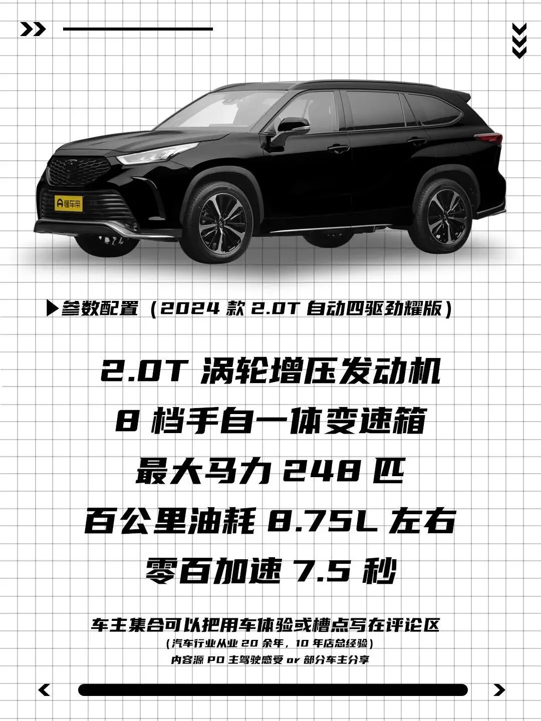 搭载2.0T涡轮增压发动机+8AT变速箱,最大功率248马力,峰值扭矩380N·m,驱动形式为前驱或四驱。官方百公里加速7.5秒,综合油耗8.75L/100km。