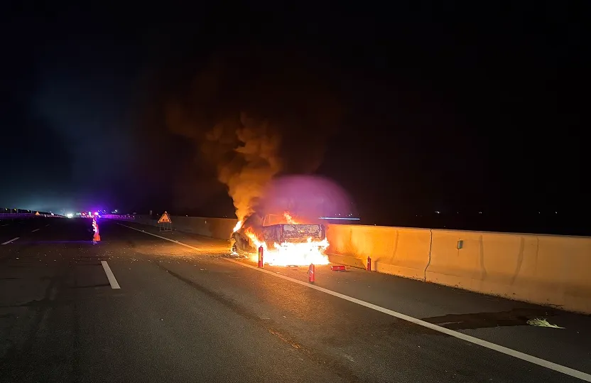 消防救援人员抵达后,经侦察确认现场无人员被困,立即对事故路段实施安全警戒,并出1支水枪对起火部位进行压制灭火。明火被扑灭后,救援人员持续对车体进行冷却,直至确认无复燃风险后才撤离。