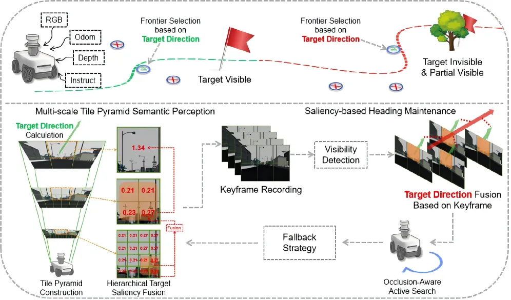 感知模块接收RGB图像,通过多尺度图块金字塔分析图像中每个区域与目标描述的语义相似度,输出两个关键信号:目标方向(target direction)和目标可见性状态(visibility status)。导航模块根据这两个信号调整机器人行为:当目标可见时,方向信号直接引导前沿点选择;当目标被遮挡时,系统利用存储的关键帧维持航向,并触发主动搜索或回退策略。