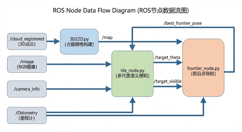这三个节点通过ROS话题松耦合连接,形成了从感知到决策的完整链路。tile_node.py是感知核心,负责多尺度语义分析和关键帧管理;frontier_node.py是决策核心,负责将语义方向信号转化为具体的导航目标点;3D22D.py则提供环境的几何表示,用于避障和前沿点检测。
