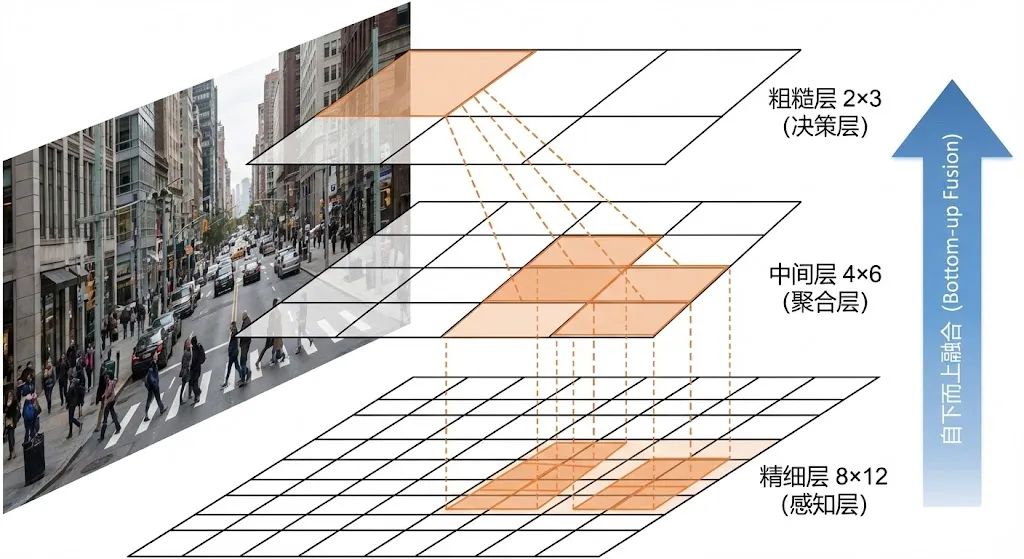 图块金字塔结构:层级3(粗糙层): 2 x 3 = 6 个图块 ← 最终决策层层级2(中间层): 4 x 6 = 24 个图块 ← 中间聚合层层级1(精细层): 8 x 12 = 96 个图块 ← 底层感知层对齐关系:- 层级3的每个图块 = 层级2的 2x2 个图块- 层级2的每个图块 = 层级1的 2x2 个图块- 层级3的每个图块 = 层级1的 4x4 个图块(16个)