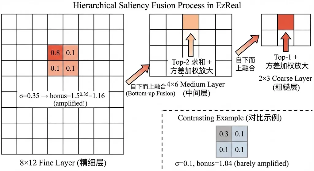 层级融合是EzReal将微弱的底层信号逐层放大为稳定方向估计的核心机制。其基本思想是:如果一个粗糙图块对应的精细子图块中,存在某个子图块的语义得分明显高于其兄弟图块(即局部方差大),那么这个粗糙图块就应该获得额外的"显著性加成"。反之,如果所有子图块的得分都差不多(方差小),说明这个区域没有目标,不应该被放大。