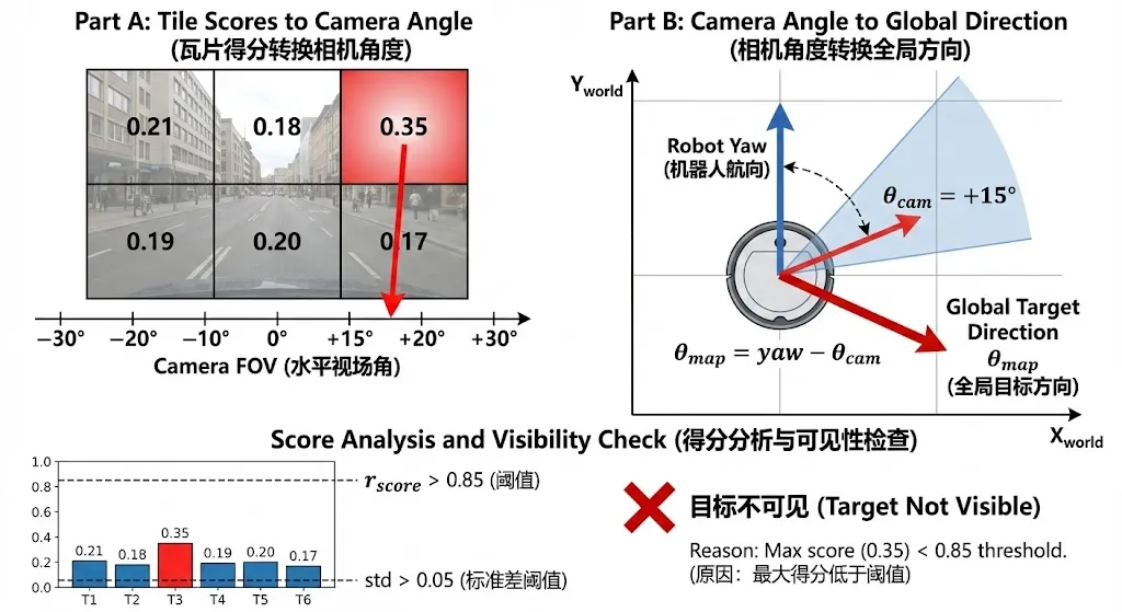 # tile_node.py — 方向计算与可见性判断# 1. 计算每个图块中心对应的相机坐标系角度def map_tile_to_cam_angles(grid, h_fov): """将图块索引映射为相机水平视场角""" rows, cols = grid tile_angles = [] for i in range(rows): for j in range(cols): center_ratio = (j + 0.5) / cols - 0.5 # [-0.5, 0.5] angle = center_ratio * h_fov # 映射到FOV范围 tile_angles.append(angle) return tile_angles# 2. 可见性判断:基于显著性比率和标准差的双重阈值max_score = float(np.max(scores))mean_score = float(np.mean(scores))std_score = float(np.std(scores))r_score = max_score / (mean_score + 1e-6) # 稀疏比率visible = (r_score > 0.85 and std_score > 0.050)# 3. 方向转换:相机角 → 全局地图角if visible: best_idx = int(np.argmax(scores)) best_angle_cam = float(tile_angles[best_idx]) # 相机角度 + 机器人朝向 = 全局方向 theta_in_map = current_yaw - best_angle_cam theta_in_map = (theta_in_map + math.pi) % (2 * math.pi) - math.pi可见性判断的逻辑值得展开说明。系统使用两个条件的"与"来判断目标是否可见:稀疏比率 r_score 衡量最高得分相对于平均得分的突出程度,标准差 std_score 衡量得分分布的离散程度。只有当两者都超过阈值时,才认为目标可见。这种双重条件可以有效过滤两类误报:(1)所有图块得分都很高但差异不大的情况(高均值低方差,可能是语义相似的背景);(2)某个图块得分略高但整体分布平坦的情况(噪声波动)。