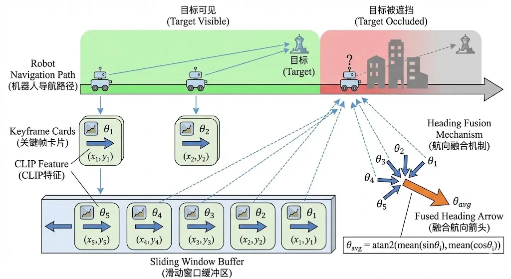 每当目标可见且系统成功估计出全局方向时,当前观测会被存储为一个关键帧。每个关键帧包含四个要素:目标区域的CLIP语义特征向量、目标的全局方向角、以及机器人当时的位置坐标。这些关键帧被维护在一个固定大小的滑动窗口中(默认容量50帧),新帧进入时最旧的帧被淘汰。