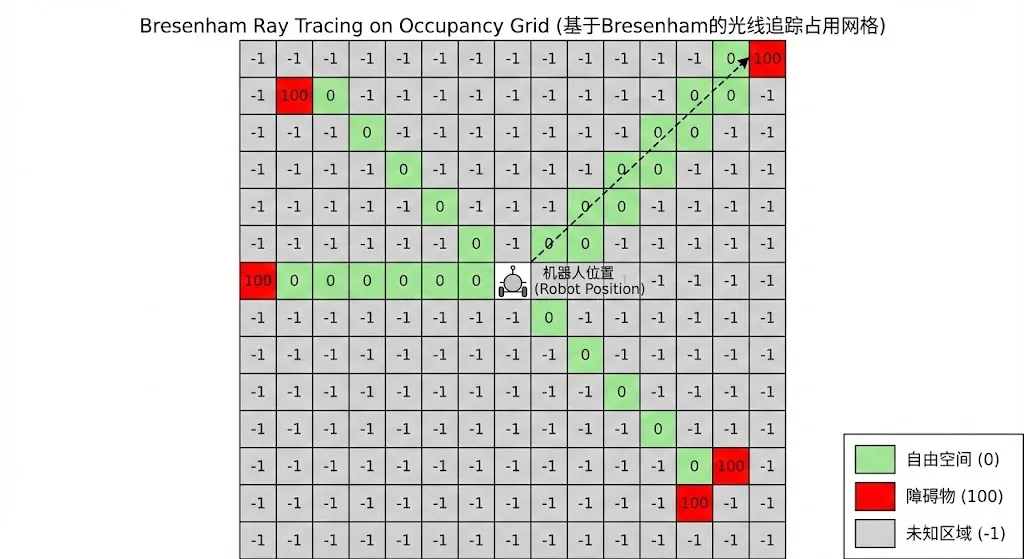 # 3D22D.py — 射线追踪标记自由空间def _mark_ray_free(self, x0, y0, x1, y1): """从机器人位置到点云端点画射线,沿途标记为自由空间""" # Bresenham直线算法 x, y = x0, y0 dx, dy = abs(x1 - x0), abs(y1 - y0) sx = 1 if x0 < x1 else -1 sy = 1 if y0 < y1 else -1 err = dx - dy while True: if x == x1 and y == y1: break if self.grid[y, x] == -1: # 未知 → 自由 self.grid[y, x] = 0 e2 = 2 * err if e2 > -dy: err -= dy; x += sx if e2 < dx: err += dx; y += sy # 射线端点标记为障碍物 self.grid[y1, x1] = 100这段代码实现了经典的占据栅格更新逻辑:从机器人位置向每个点云端点发射射线,射线经过的栅格标记为自由(0),端点标记为障碍(100),未被射线触及的区域保持未知(-1)。