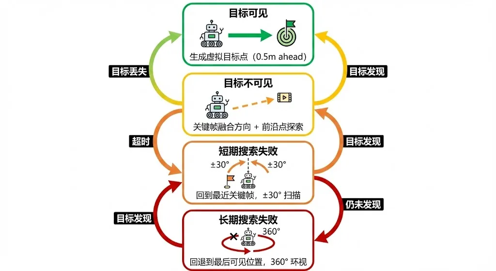 目标可见 → 生成虚拟目标点(沿目标方向0.5米处),直接朝目标前进目标不可见 → 使用关键帧融合方向,选择对齐的前沿点探索短期搜索失败 → 导航到最近关键帧位置,执行 ±30度 扫描长期搜索失败 → 回退到最后一次看到目标的位置,360度全景环视