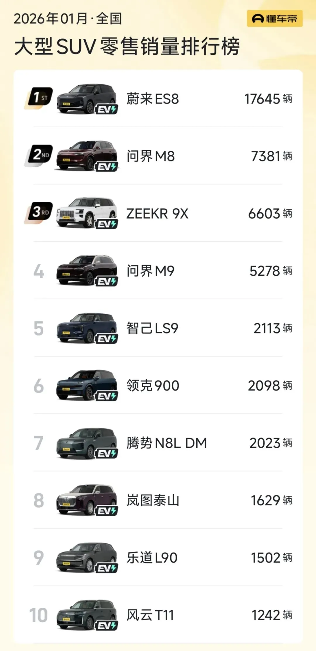 力压问界M8、极氪9X、问界M9等强敌,连续2个月稳坐大型SUV的销冠位置,且销量遥遥领先。
