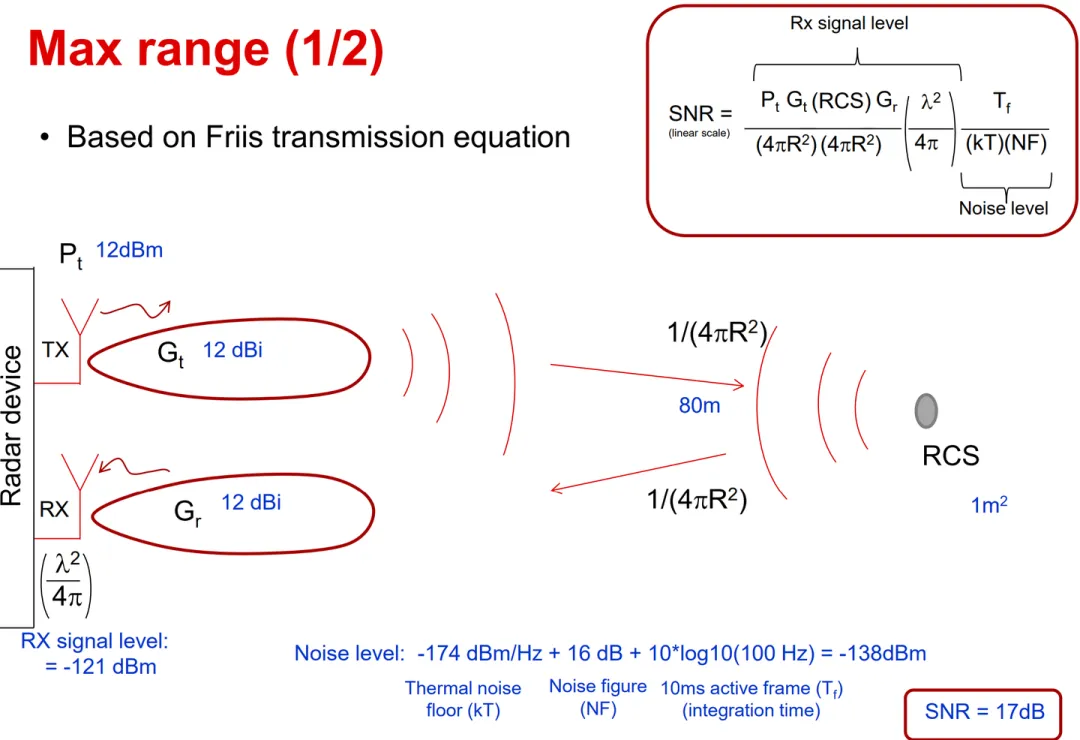 - 最大测量距离依赖雷达方程,但是FMCW设计最大测距和Chirp设计相关,这个设计值一般小于雷达方程中的最大作用距离;