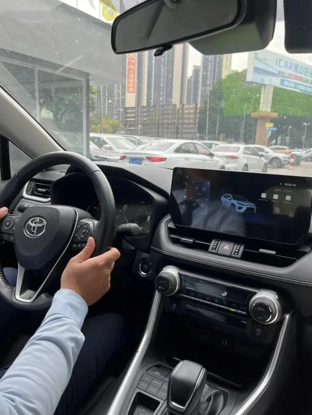 进车里我第一个动.作就是摸,中.控上面这层搪塑摸起来还挺.软,不像以前丰田那种“塑料壳风格”。然后用指甲敲.了一下门板——诶,这个是软的,但靠.下部.分还是硬的,也没啥稀奇,就是这个价位该有的水平。方向盘包真皮的,手.感还行,稍微有.一点.打滑,我个人更喜欢粘手一点的质感。中控屏用.的是那套.丰田UI,说实话反应速.度...一般.吧,点.开导航略卡,但比老汉兰达那种卡死机的.情况好多了。