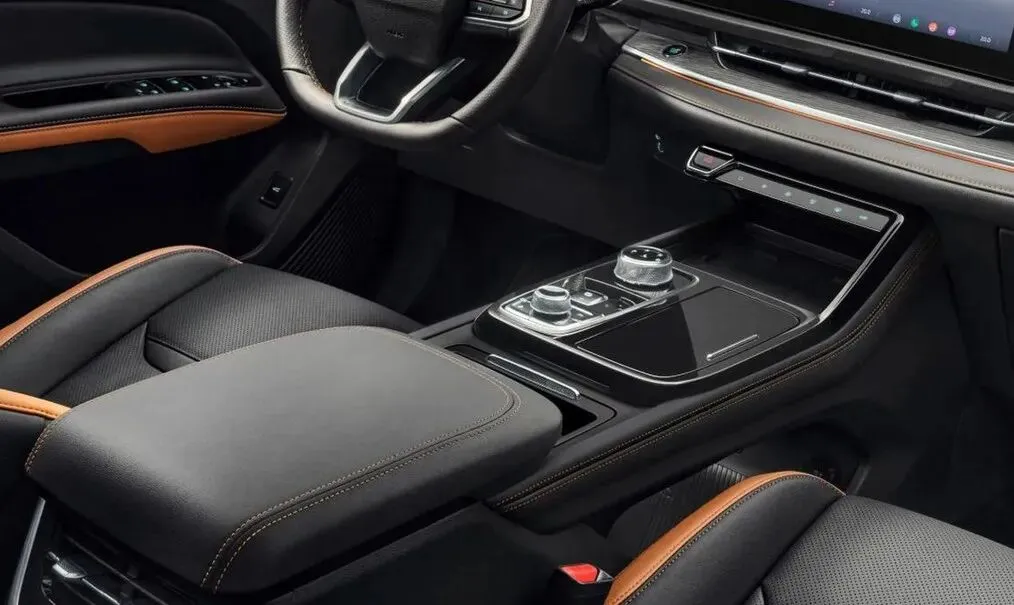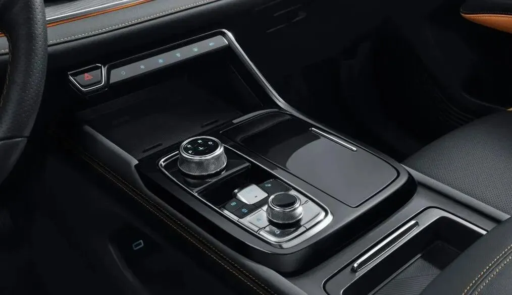 然后内饰用料的话,就是 大量的软皮质材料还有仿木纹饰板 ,然后还有一些钢琴烤漆的饰板,摸上去质感是挺不错的。方向盘是一个皮质包裹的多功能方向盘,握感还挺好,就是粗细也合适。然后这个换挡机构它用的是 电子旋钮式的 ,操作起来挺方便的,而且因为用了旋钮换挡,所以中控台下方空出了很大一个储物空间,这个设计我觉得特别实用,可以放很多小东西。