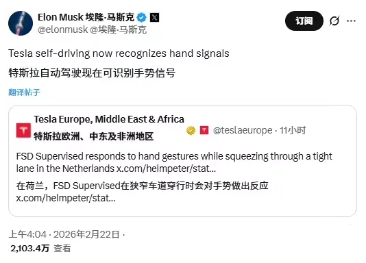 马斯克转发的是2月22日特斯拉官方发布的最新测试视频,该视频展示其特斯拉FSD Supervised 系统在欧洲道路环境下的技术进展。视频内容显示,测试车辆在荷兰境内狭窄车道行驶过程中,系统能够实时捕捉并解析前方人员的手势指令,据此执行前进或停车等操作,展现出接近人类驾驶员的判断能力。为什么对于自动驾驶汽车看懂人类手势如此重要呢?关键在于这将突破传统自动驾驶的感知局限,补齐 “人机交互 + 复杂路况应对” 的关键短板。自动驾驶的核心痛点的之一,是难以应对红绿灯、交通标识之外的非规则交互场景,而手势作为人类通用的肢体语言,是道路交互中不可或缺的补充。此次特斯拉 FSD v14.2 版本优化后,可精准识别交警指挥手势、对向车辆驾驶员示意手势、行人通行手势等多种场景 —— 比如红灯时交警示意通行、停车标识前被示意前进,甚至路口对向车辆挥手示意变道,系统都能快速响应、正确决策,无需人工干预且无迟疑、急刹等异常表现。这彻底解决了传统自动驾驶 “只认硬规则、不懂软交互” 的弊端,大幅降低复杂路况下的碰撞风险,让自动驾驶更接近人类驾驶员的判断水平。高阶自动驾驶的关键,不仅是识别道路物体,更要理解人类的社交交互逻辑,这也是特斯拉 FSD 迭代的核心方向。手势识别功能的落地,意味着系统从 “被动识别物体” 升级为 “主动解读人类意图”,具备了初步的 “社会性认知” 能力 —— 这种能力源于海量真实驾驶数据的深度学习,而非简单的规则编码,让系统能更好地融入人类驾驶场景,减少与人类驾驶员、行人的交互冲突。同时,手势识别与此前的紧急车辆识别、驾驶员意图预测等功能结合,进一步完善了自动驾驶的感知体系,为完全自动驾驶(L4 及以上)的普及奠定了基础,也是特斯拉在自动驾驶领域拉开竞争差距的重要优势。