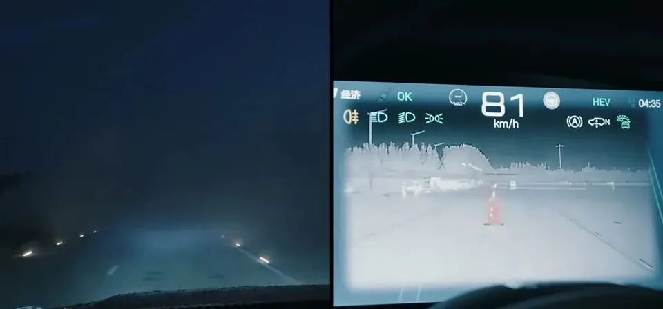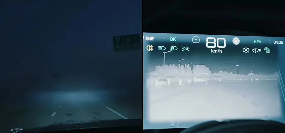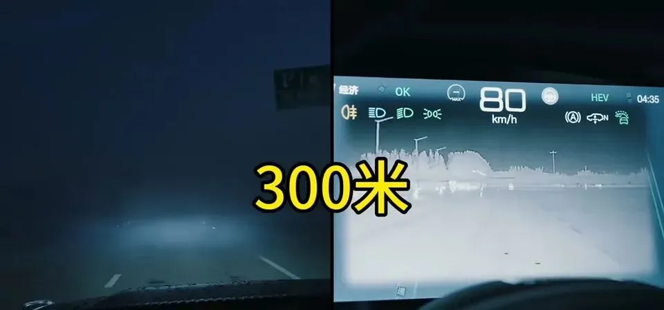 先说穿透力。长波红外的穿透力是传统远光的三倍,面对暴雨倾盆或者雾霾等能见度低的天气,它也能穿透雨雾,看清路的每一寸。