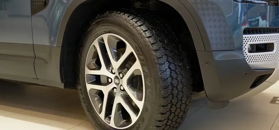 轮胎和轮毂也很卫士:标配20寸的双五幅造型轮毂,出厂自带越野型轮胎,255毫米胎宽,60%的扁平比。说实话,这个搭配就是在告诉你——它不是只想停在商场门口。