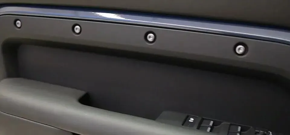 进车里,你会发现卫士的内饰逻辑很统一:它不追求一眼豪华,而是追求“结实、可造”。内饰方面大量外露的铆钉以及其他实木,橡胶蒙皮材质的应用,这种风格就像工具箱——不花哨,但你觉得它耐用。