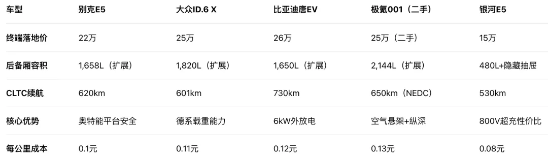 要安全能装选别克E5(1,658L真能塞),图德系大肚冲ID.6 X(1,820L真变态),玩摆摊外放上唐EV(6kW真实用),追纵深载重买二手极氪001(2.1米真能拉),抠预算性价比入银河E5(15万真省钱)!验车务必带卷尺+OBD仪!