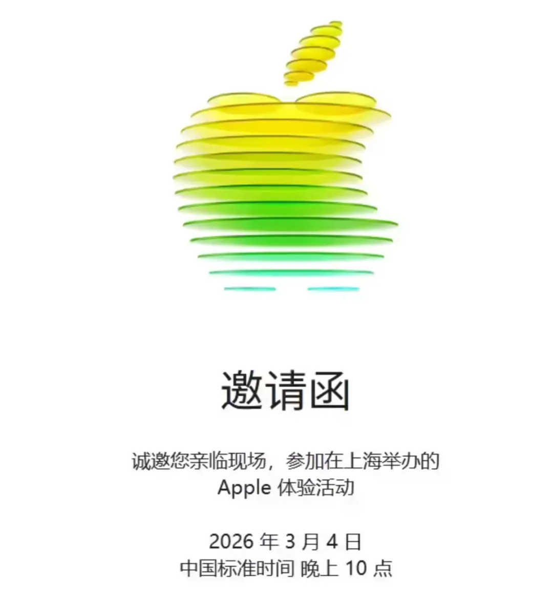 :等一手 DeepSeek 的更新。。。( IT 之家)据悉,苹果将于 3 月 4 日晚上 10 点在上海举行 Apple 体验活动。苹果近期被传出将推出多款设备,包括 M5 Pro / Max 款 MacBook Pro、新款入门款 MacBook、Studio Display 2 显示器、M5 Pro / Max 款 Mac Studio、iPhone 17e 等产品。2 月 23 日消息,彭博社记者马克・古尔曼透露,全新低配版 MacBook 推出的可能性极高。苹果官方邀请函的图案中,还融入了该机型网传的配色方案。而 Mac Studio 与 Studio Display 两款产品若同时在本次活动发布,会显得“过于冗余”,这两款产品更多只是处于苹果的研发管线中,暂未到发布节点。