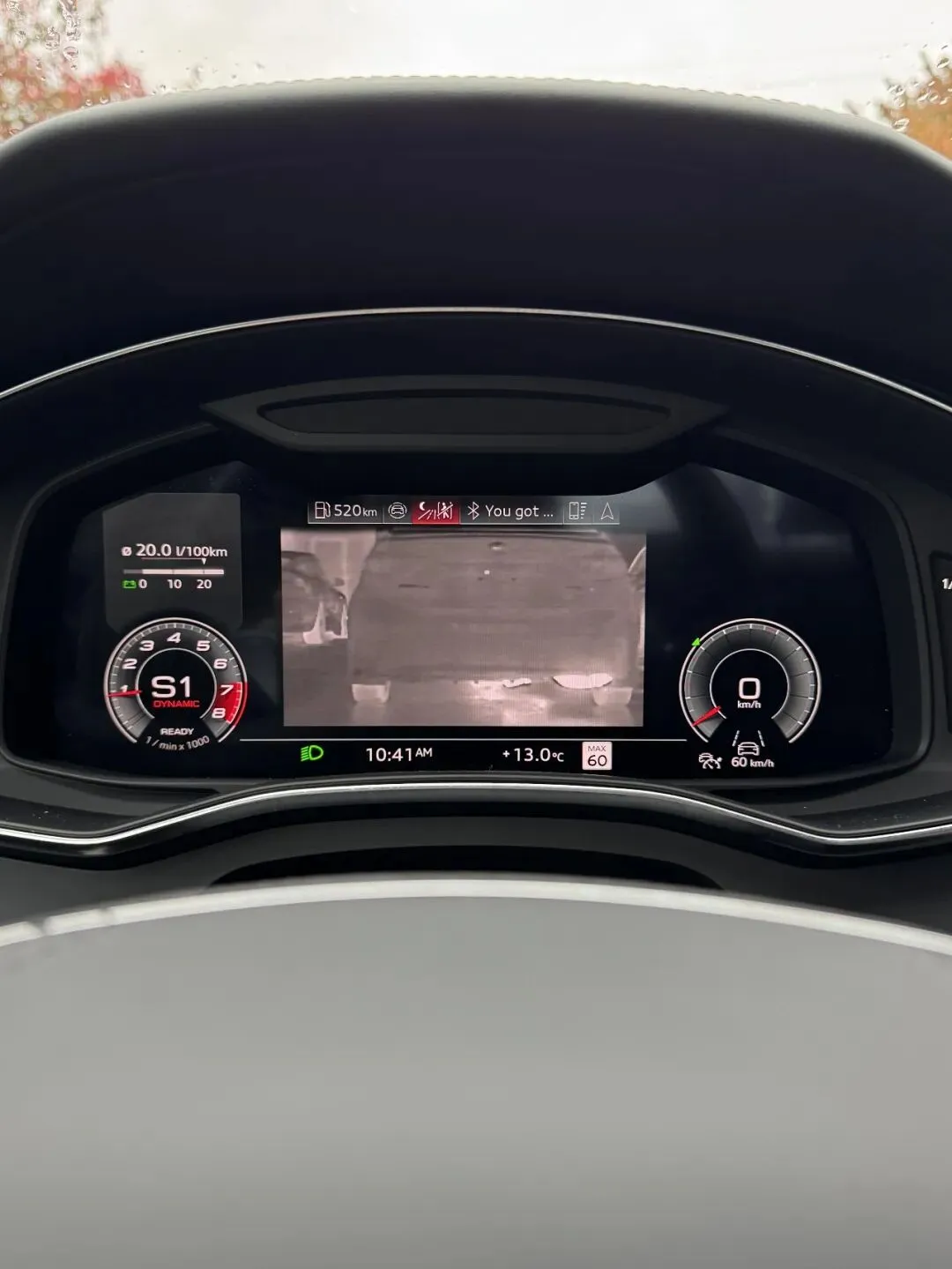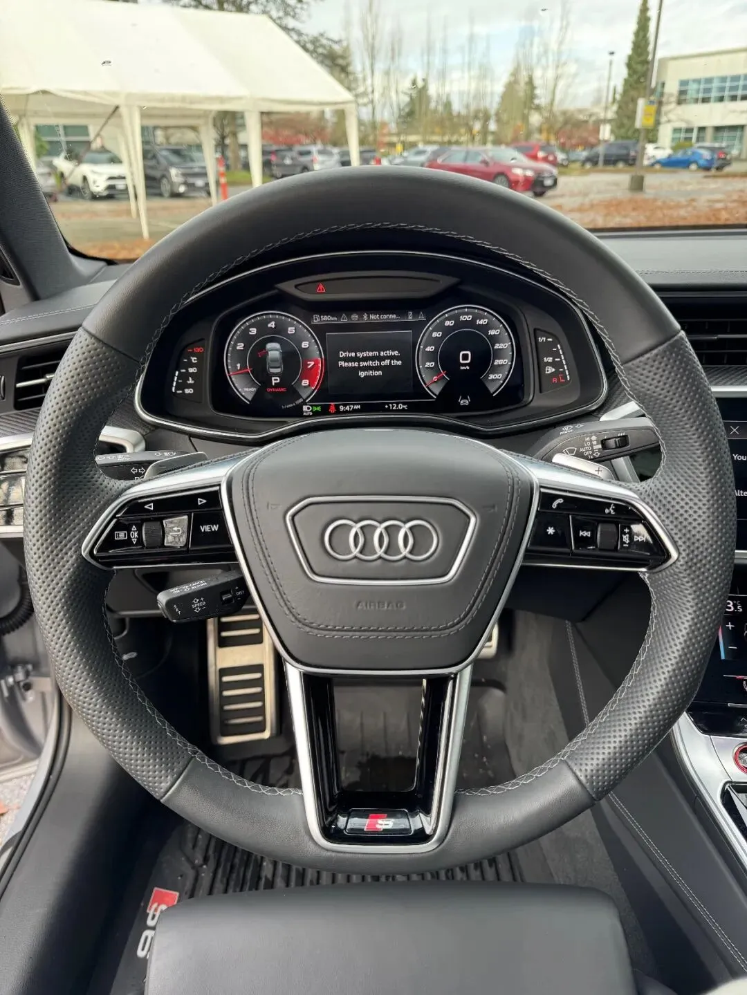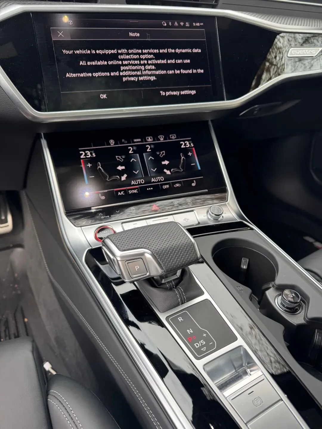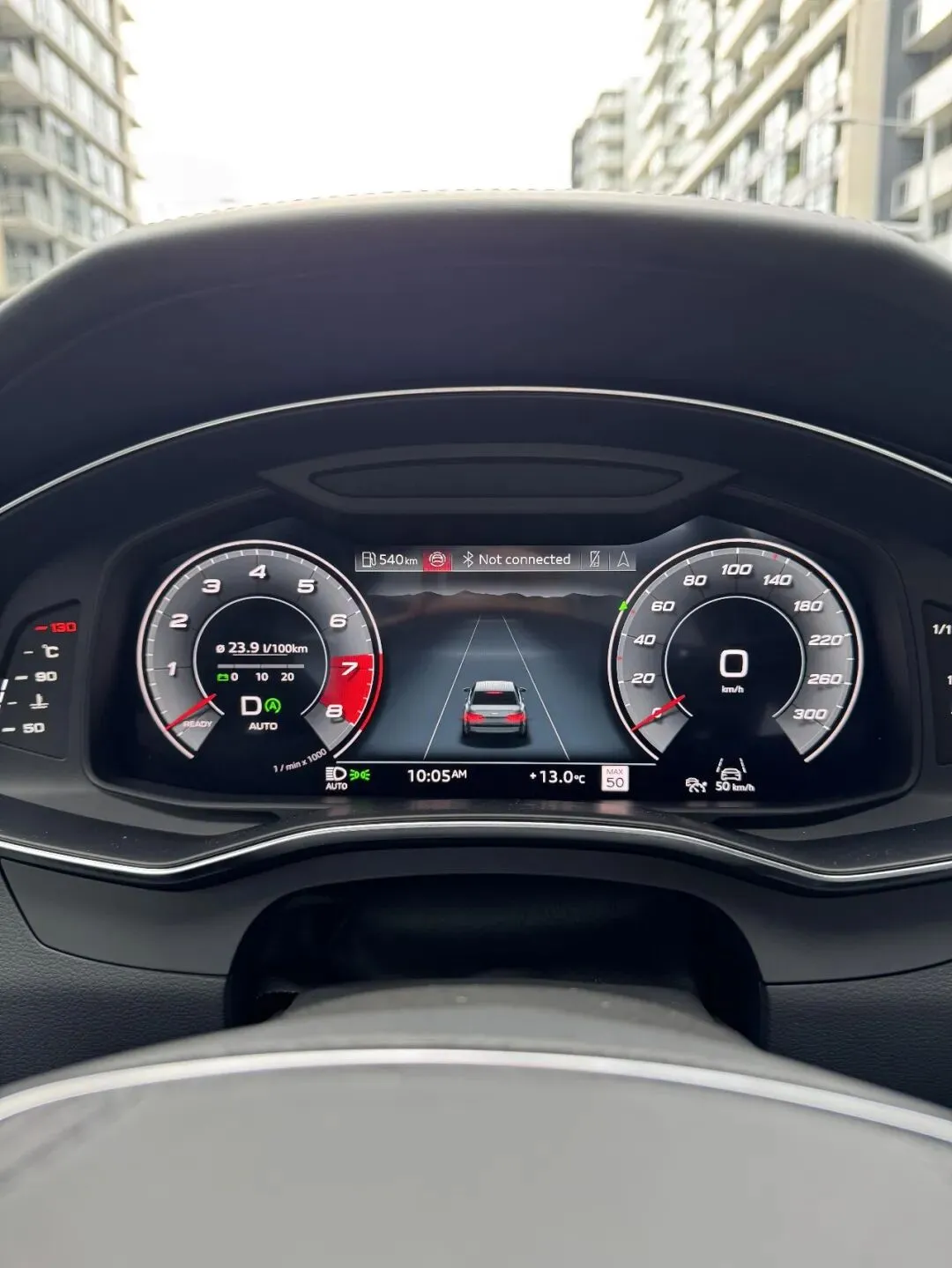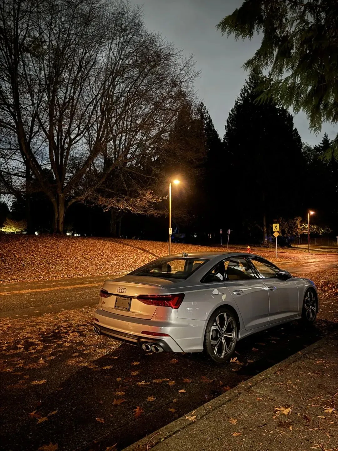来到驾驶层面,这代奥迪S6摒弃了V8,转而采用RS5同款2.9TV6发动机,444匹马力中规中矩,但这台车开起来却并不中庸。空气悬挂搭配四轮转向,日常驾驶很舒适,转向很轻,指向中规中矩,一如既往的没有路感传递。切到动态模式,空气悬挂降至最低位,悬挂紧绷起来,运动排气阀门打开,伴随着夸张的升档声和松油噼里啪啦的回火,这种绅士光膀子的一面太有意思了! 整台车能随时在两种截然不同的身份下自由切换,的确给到我很多惊喜。虽然实际的加速能力并不算出众,变速箱降档也不算快,空气悬挂在激进驾驶状态下对车身姿态控制也略显吃力,前轴还略显慵懒,但在这幅美丽皮囊和奇迹般的排气声浪下,以上提到的短板似乎都没那么重要。