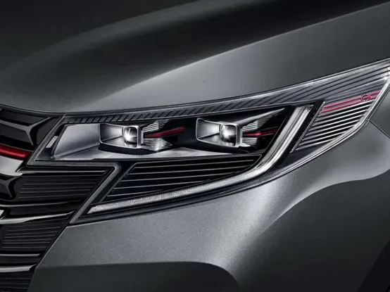 大灯,采用异型化轮廓设计的头灯,线条犀利,颜色深邃,充满科技感,据说灵感来源于超音速战机,强调速度感和现代感,横向贯穿布局增加前脸的视觉宽度。