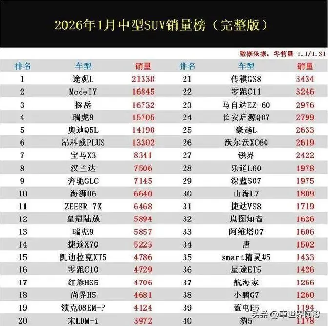说实话,我刚刷到数据那会儿,手机都差点摔了。朋友圈里还一堆人在喊“新能源才是未来”,结果一月数据啪啪打脸。榜单前十,燃油车直接占了八席:途观L 21330辆创近一年新高,探岳、瑞虎8、奥迪Q5L全破万,连汉兰达都杀到7000+。豪华品牌集体回暖,宝马X3、奔驰GLC也杀回7000大关。新能源呢?特斯拉Model Y跌到16845辆,环比缩水5万,像被抽了筋;比亚迪海狮06、宋L DM-i直接掉到6640和3972辆,新势力更惨,零跑C10、C11连前二十都挤不进,彻底凉透。
