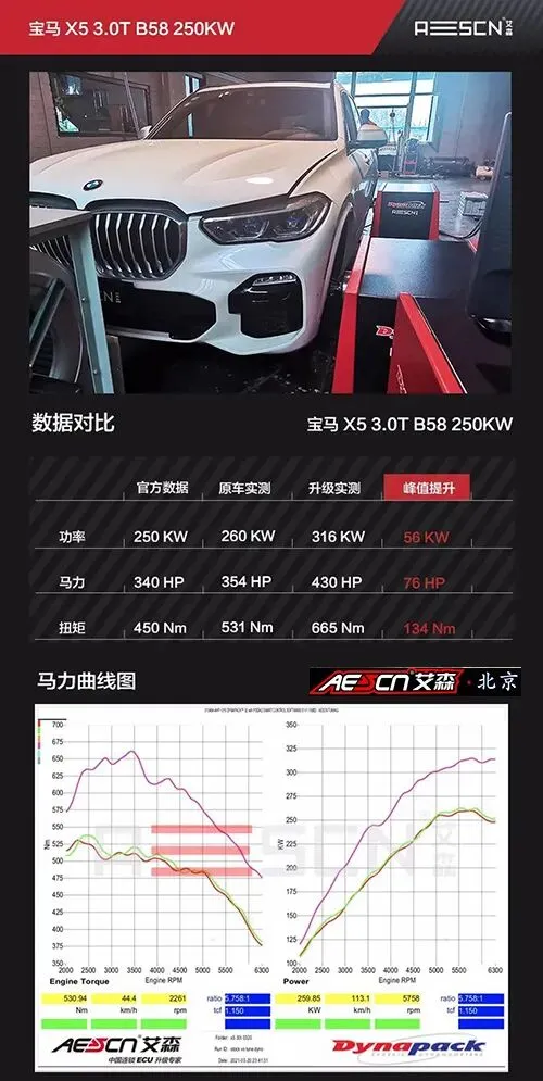 宝马X5 xDrive40i搭载的是代号为B58的3.0T直列六缸发动机,其最大功率:250kW(340PS)/ 5500-6500rpm,最大扭矩450N·m/1500-5200rpm的参数也是主流的,跟它的竞争对手在同一水平。变速箱当然还是宝马那台来自ZF的8AT,这种变速箱在家族多款产品上有覆盖,总体表现是不错的。对于一款运动见长的车型来说,充足的动力储备是不可或缺的,即便是不用,但用的时候必须要有。为了能在安全范围内拓展出这款车在国内最佳的动力与操控,一对一定制的刷ecu是个不错的选项。选择刷ECU的原因