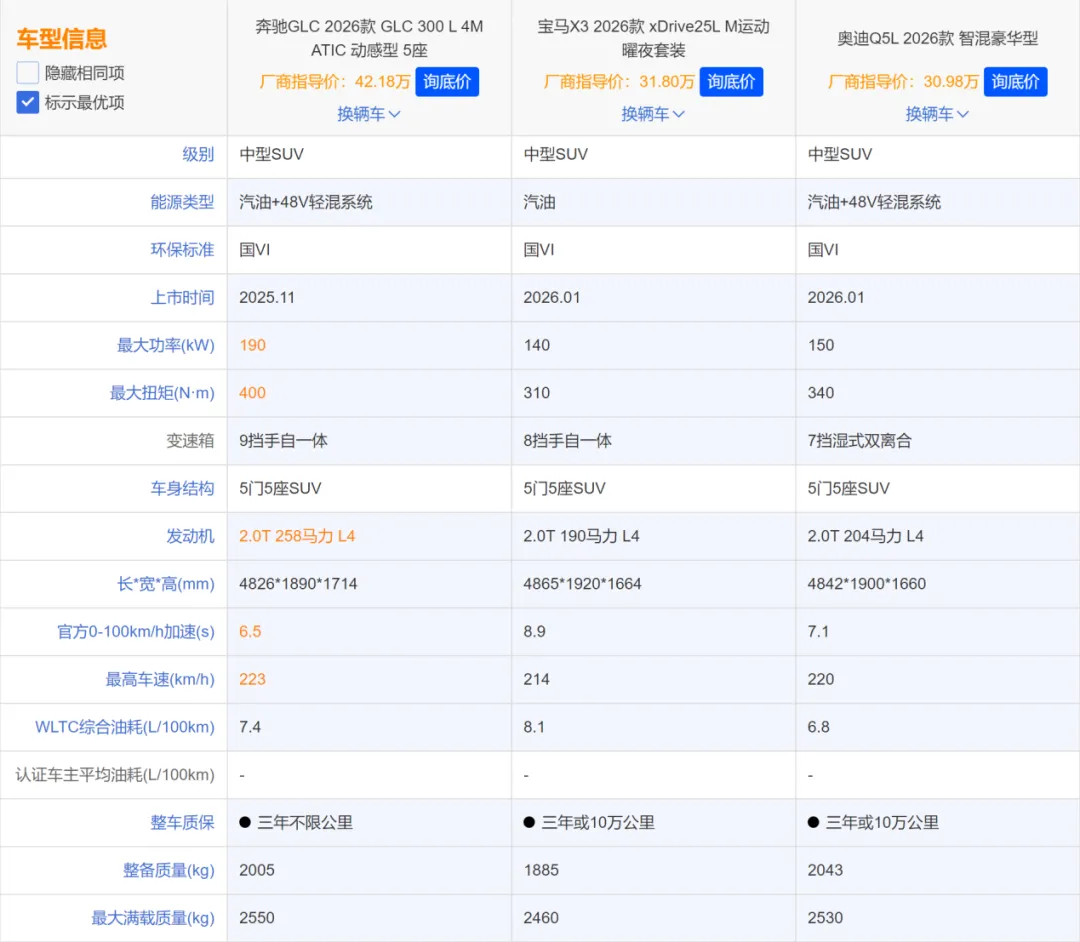 在豪华中型SUV市场,奔驰GLC、宝马X3、奥迪Q5L常年占据“三国杀”格局,凭借BBA的品牌光环、均衡的产品力和广泛的用户基础,成为30-40万预算消费者的核心备选。但三款车的定位差异显著,并非闭眼可入。结合当前市场行情、产品实力及性价比,接下来我将从产品力、适配场景、性价比三个核心维度,帮你在30-40万豪华SUV市场做出最稳妥的选择。