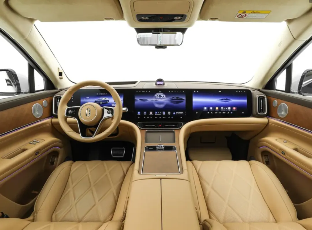 坐进车里,你就知道什么叫“堆料狂魔”了。全车Nappa真皮包裹,还是抑菌率≥99%的那种,这就很符合老板们对健康的焦虑。棕色的内饰配上菱形格缝线,温馨又不失档次。