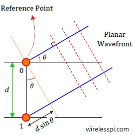 考虑一个只有两个单元的间距为d的天线阵列。选择上方天线作为参考点,当平面波以一定角度到达时会发生什么情况?显然,波必须传播一段额外的距离才能到达下方天线。
