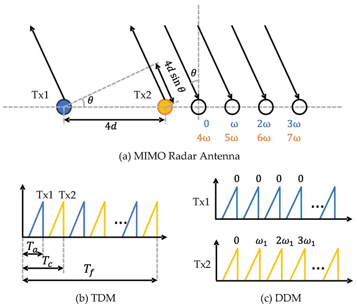 FMCW DDM多普勒分复用,DDM同时发射所有Tx波形,并在多普勒域中将它们分离。为了实现波形正交性,对于 第k个发射机,在相邻的chirp中添加多普勒频移,ωk=2π(k-1)/N。其中 N 通常选为 Tx 天线的数量 NTx。DDM 的一个缺点是其无模糊多普勒速度降低到 原来的1/N。