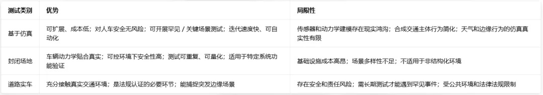 当前的发展趋势倡导采用混合测试流程:以仿真测试进行场景探索,以封闭场地测试开展功能验证,以道路实车测试完成最终法规认证。表 1 总结了三种测试方法的利弊权衡。