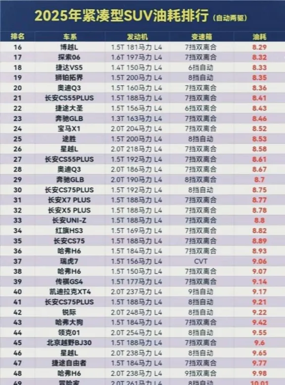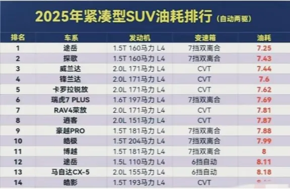 家里打算添辆SUV的朋友,估计没少为油耗这事犯嘀咕吧?毕竟买车不是一锤子买卖,油钱可是天天要掏的,尤其是过日子讲究细水长流的,更得把账算明白。最近翻了翻今年挺火的紧凑型SUV油耗榜单,里头门道还真不少,今儿就跟大伙唠唠,看看哪些车是真省油,哪些是看着漂亮却费油的坑。