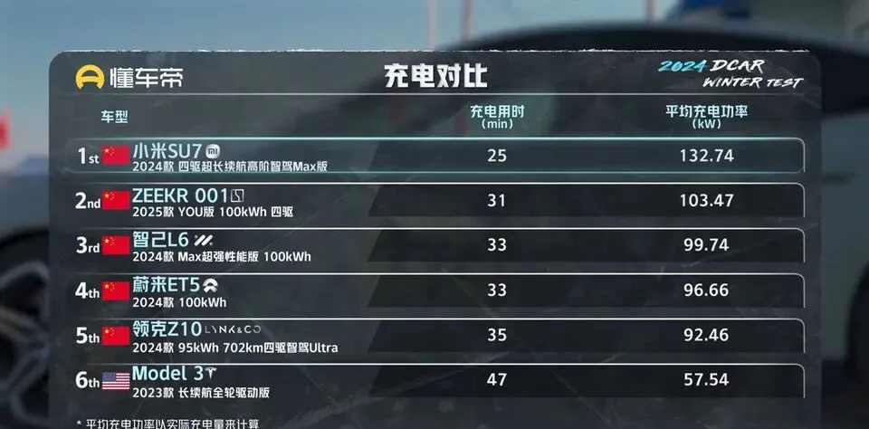 结果还是它:充电对比表现最好的是小米SU7,充电仅用时25分钟。