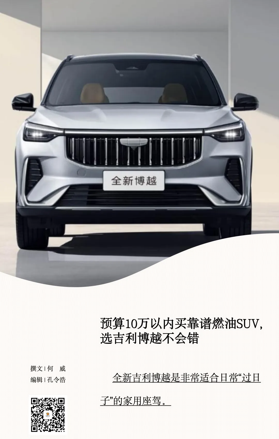 虽然新能源SUV正逐步成为中国车市的主流,但受限于充电条件、易用性等因素,依旧有一半的中国消费者在选择燃油车。作为2025年中国车市销量排名前二的燃油SUV,吉利博越在去年8月升级推出了新款。新设计和全面跃升的产品力,使得全新博越依旧是10万元以内价位出类拔萃的燃油SUV,对于购车预算有限的网友而言这款车非常值得优先考虑。