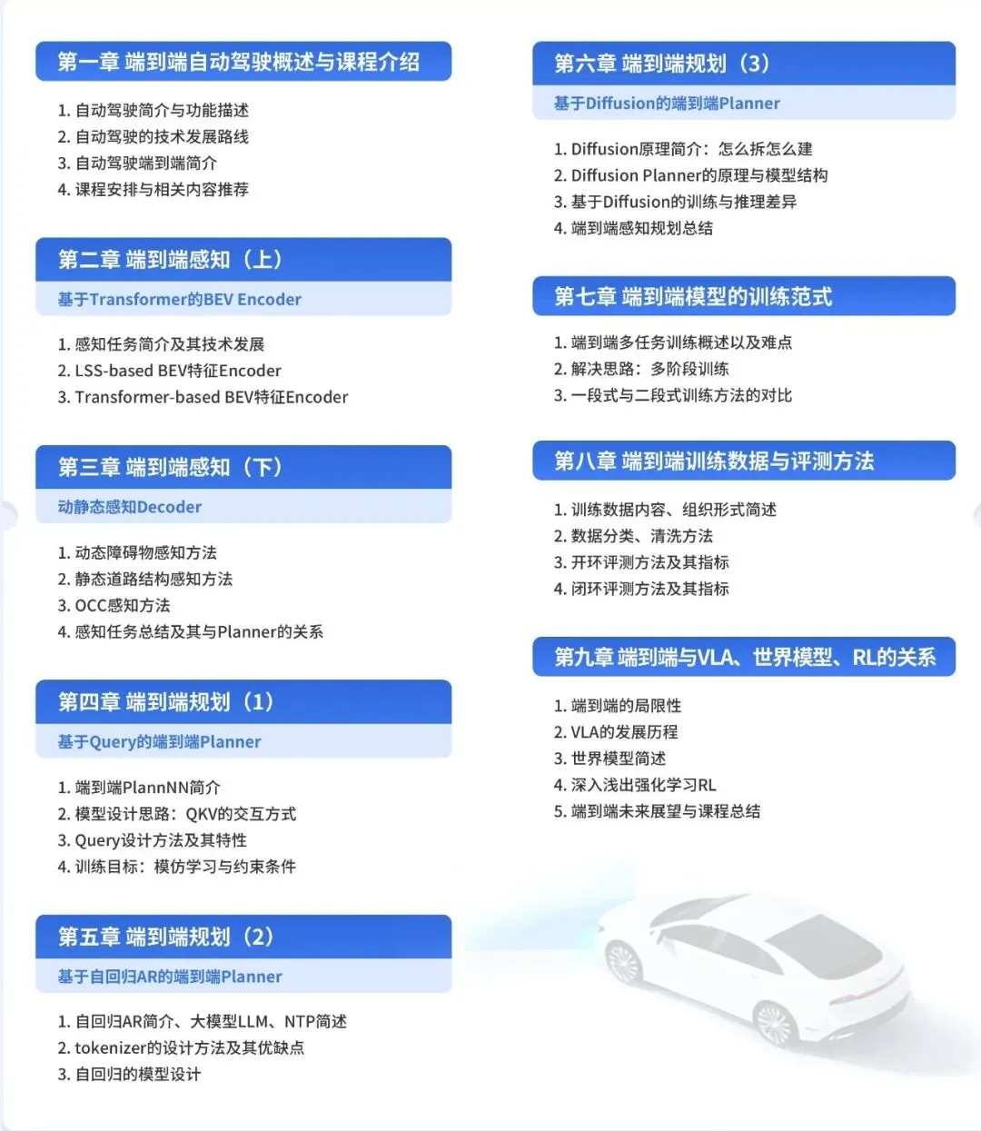 全面掌握端到端自动驾驶的核心理论,理解感知与规划的端到端融合逻辑,清晰认知自动驾驶技术发展路线与行业趋势。