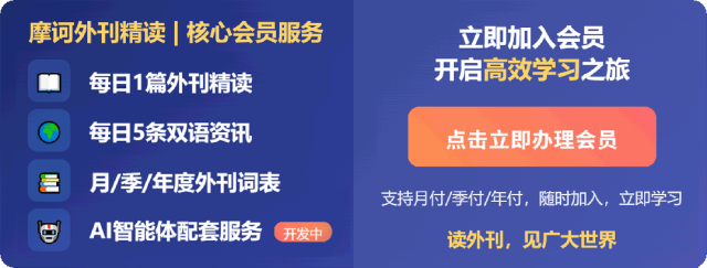 即可获取每日外刊精读笔记+每日5条双语资讯(含对应外刊原文)+周期性外刊高频词表/外媒动态简报+有效期内外刊更新等专属权益。