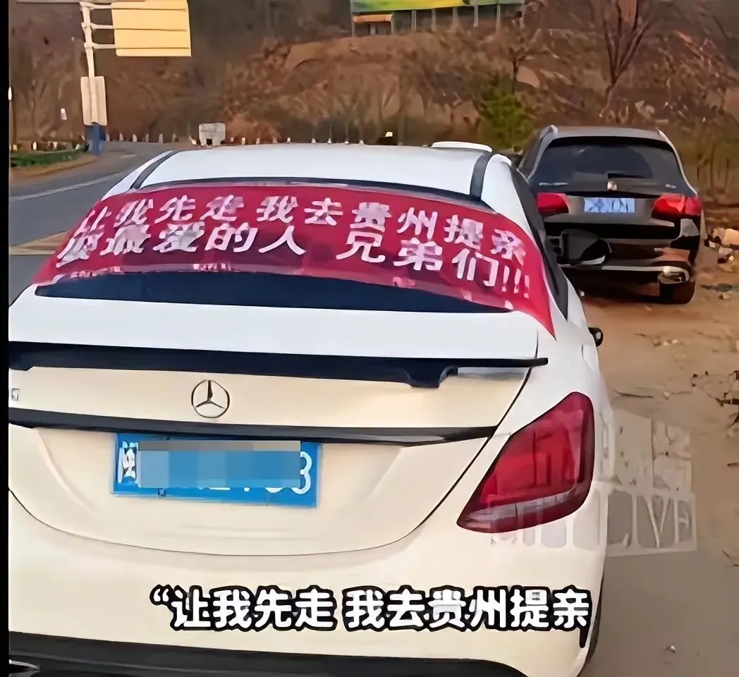 2月22号这天,谭先生正式出发了,他开着自己那辆闽B牌照的车,还在车身上挂了一条红底白字的横幅,上面写着“让我先走,我去贵州提亲,娶最爱的人,兄弟们!!”,字特别醒目,一眼就能看到。
